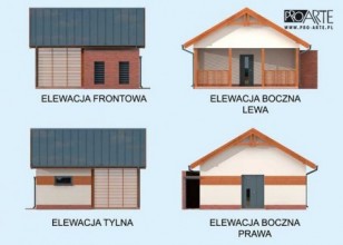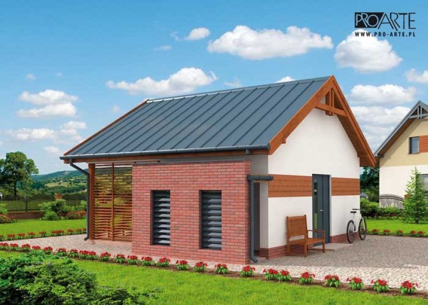 Budynek gospodarczy z werandą i z pomieszczeniem na drewno i odpadki bez bramy. Projekt składa się z części architektonicznej, konstrukcyjnej i wewnętrznej instalacji elektrycznej. W projekcie załączone są podstawowe zestawienie stali, drewna i stolarki okienno-drzwiowej. Do projektu dołączamy bezpłatną zgodę na wprowadzenie zmian, oświadczenie projektantów o wykonaniu projektu zgodnie z obowiązującymi normami i przepisami oraz kserokopie uprawnień projektantów wraz z aktualnym wpisem do izby. W przypadku zamówienia projektu w technologii lekkiej, drewnianej konstrukcji szkieletowej, powierzchnia użytkowa budynku jest o około 7% większa.
