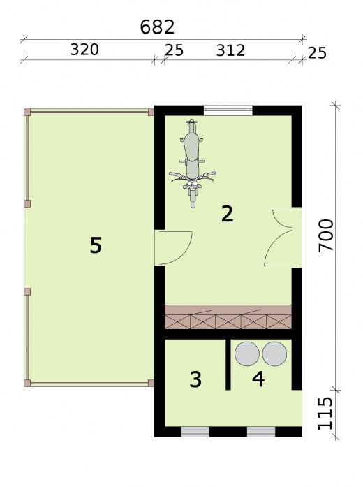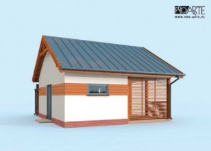 Budynek gospodarczy z werandą i z pomieszczeniem na drewno i odpadki. Projekt składa się z części architektonicznej, konstrukcyjnej i wewnętrznej instalacji elektrycznej. W projekcie załączone są podstawowe zestawienie stali, drewna i stolarki okienno-drzwiowej. Do projektu dołączamy bezpłatną zgodę na wprowadzenie zmian, oświadczenie projektantów o wykonaniu projektu zgodnie z obowiązującymi normami i przepisami oraz kserokopie uprawnień projektantów wraz z aktualnym wpisem do izby. W przypadku zamówienia projektu w technologii lekkiej, drewnianej konstrukcji szkieletowej, powierzchnia użytkowa budynku jest o około 7% większa.