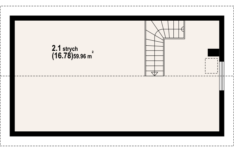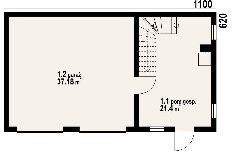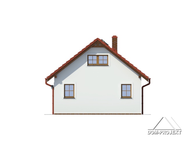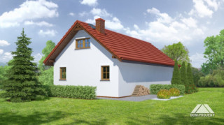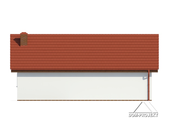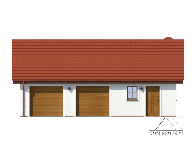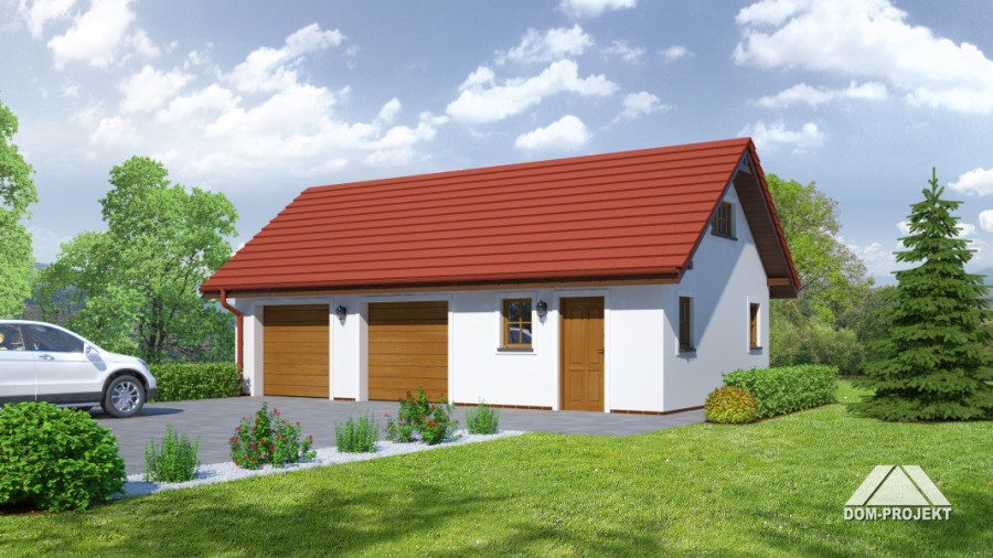 Garaż na dwa samochody, pomieszczenie gospodarcze i strych na cele gospodarcze. Prosta bryła budynku i dach dwuspadowy.