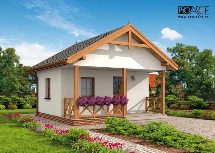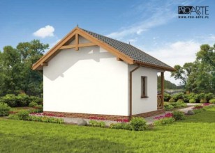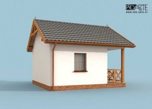 Haga - mały domek letniskowyZdecydują się na niego wszyscy, którzy nie mają wielkich wymagań, chcą jedynie spokoju i zasłużonego wypoczynku w zaciszu. Dostępność projektu w wersji z obiciem drewnianym sprawia, że z pewnością świetnie będzie się prezentował poza miastem. Drewniana weranda oraz ciepły kolor ścian są idealnym połączeniem, dachówka, pokrywająca dwuspadowy dopełnia całości. Uwagę zwracają wieńczące go spiczaste wykończenia oraz weranda zachęcająca gości do wejścia. Przyjaźnie i z rozwagą zaprojektowane wnętrze, na które składają się: wiatrołap, jadalnia, pokój dzienny wyposażony w miejsce na kominek oraz łazienka dopełniająca całości. Haga to kompletny budynek, w którym znajdziemy wszystko, co do komfortowego wypoczynku konieczne.Dostępność projektu w wersji standardowej i w obiciu drewnianym ścian sprawia, że Haga jest warta rozwagi Inwestora. Projekt składa się z części architektonicznej, konstrukcyjnej, wewnętrznych instalacji sanitarnych i instalacji elektrycznej. W projekcie załączone są podstawowe zestawienie stali, drewna i stolarki okienno-drzwiowej. Do projektu dołączamy bezpłatną zgodę na wprowadzenie zmian, oświadczenie projektantów o wykonaniu projektu zgodnie z obowiązującymi normami i przepisami oraz kserokopie uprawnień projektantów wraz z aktualnym wpisem do izby. W przypadku zamówienia projektu w technologii lekkiej, drewnianej konstrukcji szkieletowej, powierzchnia użytkowa budynku jest o około 7% większa.