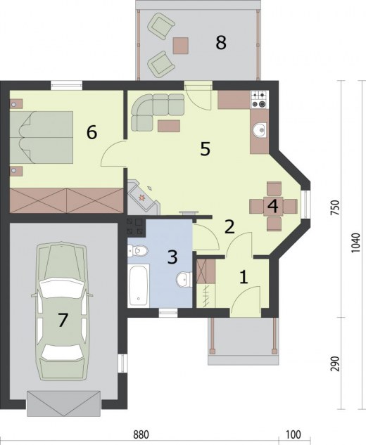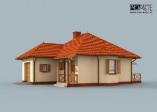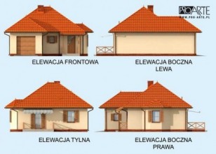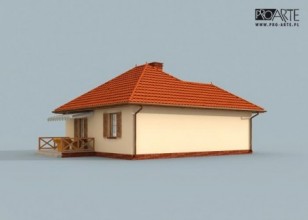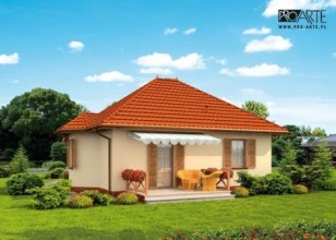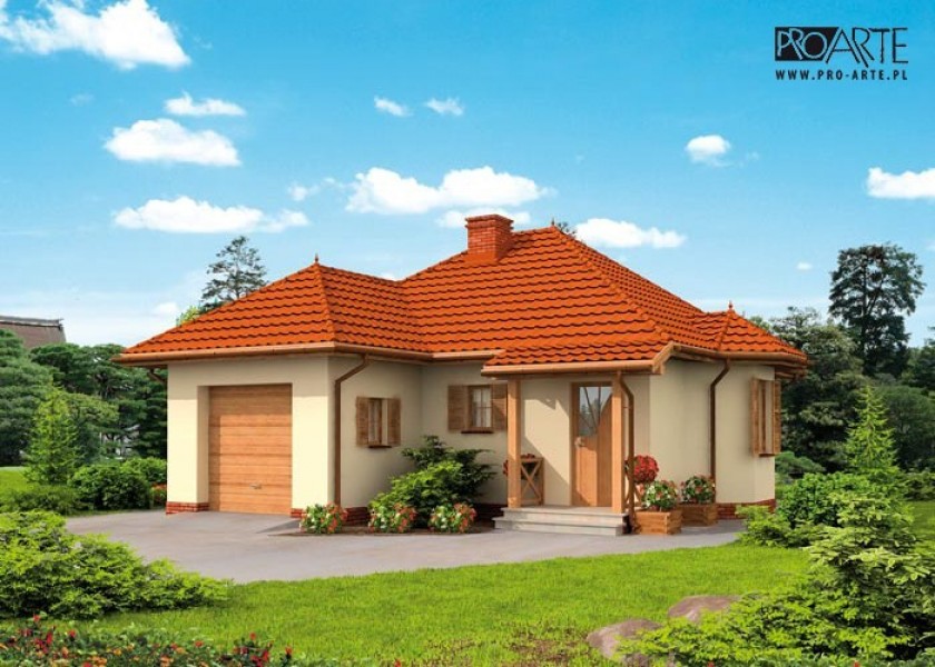 Projekt dostępny również jako CAŁOROCZNY!!! Ze względu na docieplenie budynku do każdego wymiaru widocznego na rzucie należy dodać 20cm.Zobacz czym różni się projekt domku letniskowego od domu całorocznego?KANSAS - dom letniskowyGdyby spróbować wskazać zalety projektu Kansas, to należy w pierwszej kolejności wymienić: bezpieczeństwo i praktyczne rozwiązania. Kansas to pełna szyku i uroku budowla na którą składa się dom z garażem. Piękny kopertowy dach w całości pokrywa całość budynku. Trzeb zwrócić uwagę na to, że jest to jeden z najbardziej harmonijnie i stylowo prezentujących się projektów domków letniskowych na rynku. Uwagę przykuwa budzący zachwyt wykusz, jednolita tonacja całości sprawia, że może stać się hitem spośród naszych projektów. Od południa znajduje się ganek oraz garaż i to one w na pierwszy rzut oka przykuwają uwagę. Gdy dobrze się przyjrzymy, to można zauważyć, że od wschodu w bryle budynku znajduje się wypust, to wykusz, który skrywa jadalnię. Po przejściu przez ganek, w wiatrołapie znajdziemy miejsce na garderobę pod zabudowę. Dalej, po przejściu do komunikacji, jej lewa część wiedzie do kuchni, zaś po prawej jest wspomniana jadalnia. Za nią znajduje się największe pomieszczenie, czyli pokój dzienny z aneksem kuchennym, kominkiem. Całości wnętrz dopełnia sypialnia. Z pokoju dziennego można wyjść na taras, który będzie miejscem niejednej biesiady w gronie bliskich, letniego śniadania, czy romantycznej kolacji.Projekt składa się z części architektonicznej, konstrukcyjnej, wewnętrznych instalacji wod.-kan, c. o. i elektrycznej. W projekcie załączone są podstawowe zestawienie stali, drewna i stolarki okienno-drzwiowej. Do projektu dołączamy bezpłatną zgodę na wprowadzenie zmian, oświadczenie projektantów o wykonaniu projektu zgodnie z obowiązującymi normami i przepisami oraz kserokopie uprawnień projektantów wraz z aktualnym wpisem do izby. W przypadku zamówienia projektu w technologii lekkiej, drewnianej konstrukcji szkieletowej, powierzchnia użytkowa budynku jest o około 7% większa.