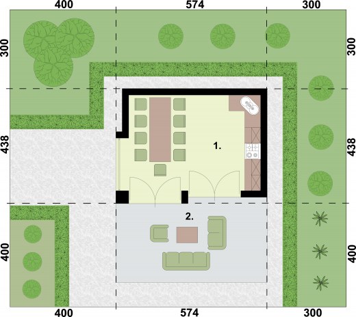 KL1 kuchnia letnia W przypadku ubiegania się o pozwolenie na budowę projekt nosi nazwą budynku gospodarczego. W części opisowej projektu znajduje się pomieszczenie gospodarcze z funkcjami aneksu kuchennego.Kuchnia letnia to rozwiązanie dla miłośników posiłków i imprez na świeżym powietrzu, którzy cenią sobie komfort wypoczynku. Możesz mieć pewność, że w kuchni letniej nie zmokniesz, nie dostaniesz udaru słonecznego, nie przewieje Cię, ani nie czekają na Ciebie i na Twoich bliskich inne niespodzianki, z którymi dotąd musiałeś liczyć się organizując piknik lub obiad, czy spotkanie w ogrodzie.Z dachem nad głową i w razie potrzeby zamykaną przestrzenią wokół stołu wszystkie niebezpieczeństwa nie są już groźne. Na wnętrze kuchni letniej składa się pomieszczenia nazwane biesiadziskiem ogrodowym. Jak nazwa wskazuje jest to miejsce do wspólnego celebrowania posiłków orazystkich małych i dużych okazji do świętowania. Aneks kuchenny będący podstawowym wyposażeniem każdej kuchni umożliwia serwowanie najświeższych posiłków.Bliskość rabat z owocami i warzywami na Twojej działce daje Ci nieograniczone możliwości tworzenia kombinacji kulinarnych i zaskakiwania swoich gości. Przeszklone drzwi balkonowe są udogodnieniem pozwalającym Ci na cieszenie się piękną pogodą. W sytuacji, gdy zbiera się na deszcz lub przeszkadzają Ci owady. Zamykasz pomieszczenie i możesz kontynuować biesiadę w sprzyjających dobrej zabawie warunkach. Co najważniejsze, nie musisz już obawiać się, że strzaskasz naczynia, znosząc je do kuchni. Przecież wszystko masz na miejscu, bliskość zlewu lub zmywarki jest tak niewielka, że i to ryzyko możesz wyeliminować.Projekt składa się z części architektonicznej, konstrukcyjnej, wewnętrznej instalacji elektrycznej i sanitarnej. W projekcie załączone są podstawowe zestawienie stali, drewna i stolarki okienno-drzwiowej. Do projektu dołączamy bezpłatną zgodę na wprowadzenie zmian, oświadczenie projektantów o wykonaniu projektu zgodnie z obowiązującymi normami i przepisami oraz kserokopie uprawnień projektantów wraz z aktualnym wpisem do izby. W przypadku zamówienia projektu w technologii lekkiej, drewnianej konstrukcji szkieletowej, powierzchnia użytkowa budynku jest o około 7% większa.