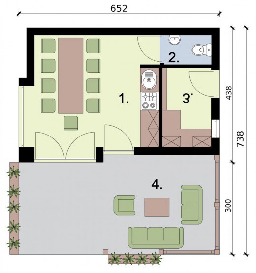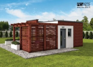 KL5 kuchnia letnia z pom. gospodarczym, WC i tarasemW przypadku ubiegania się o pozwolenie na budowę projekt nosi nazwą budynku gospodarczego. W części opisowej projektu znajduje się pomieszczenie gospodarcze z funkcjami aneksu kuchennego. Zobacz projekt w wesji domu letniskowego.Wariant ADrzwi do pomieszczenia gospodarczego znajdują się bliżej frontowej ściany domu.Wariant BDrzwi do pomieszczenia gospodarczego zostały przeunięte.Chcesz zapoznać się z pozostałymi projektami naszych kuchni? KOLEKCJA KUCHNI LETNICHProjekt składa się z części architektonicznej, konstrukcyjnej, wewnętrznej instalacji elektrycznej i sanitarnej. W projekcie załączone są podstawowe zestawienie stali, drewna i stolarki okienno-drzwiowej. Do projektu dołączamy bezpłatną zgodę na wprowadzenie zmian, oświadczenie projektantów o wykonaniu projektu zgodnie z obowiązującymi normami i przepisami oraz kserokopie uprawnień projektantów wraz z aktualnym wpisem do izby. W przypadku zamówienia projektu w technologii lekkiej, drewnianej konstrukcji szkieletowej, powierzchnia użytkowa budynku jest o około 7% większa.