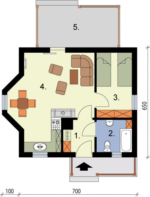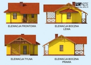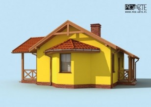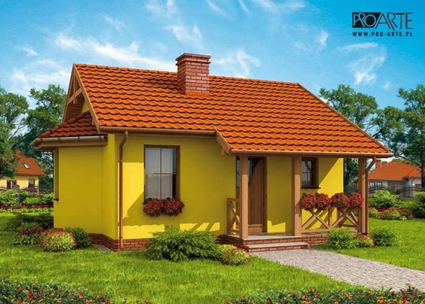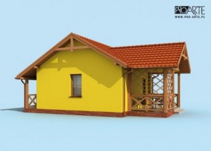 LIMONE 2– projekt domku letniskowego Zobacz czym różni się projekt domku letniskowego od domu całorocznego? Jest to projekt, który może być ziszczeniem marzeń o zacisznym domku, w którym można spędzać leniwe, ciepłe, letnie dni. Idealny dla par w każdym wieku, będzie przestrzenią, która sprzyja miłości. Zadaszony ganek zaprasza do środka, po wejściu do niewielkiego wiatrołapu, po prawej znajduje się łazienka z oknem, którą można wyposażyć w prysznic, a nawet wannę. Dalej znajduje się największe pomieszczenie, salon, połączony z aneksem kuchennym. Z obszernego salonu, dobrze doświetlonego trzema oknami, można wyjść na imponujący zabudowany taras, tworzący uroczą werandę. Będzie on z pewnością miejscem niejednej romantycznej kolacji oraz urokliwego śniadania. W domku jest jedna sypialnia, pokój dzienny połączony z aneksem kuchennym, łazienka. Ten projekt może być idealnym wyborem dla emerytów, których dzieci opuściły już rodzinny dom, szukających czegoś przytulnego i skromnego na lata emerytury. Znakomicie sprawdzi się też w przypadku każdej pary. Zobacz projekt Limone bez werandy.Projekt składa się z części architektonicznej, konstrukcyjnej, wewnętrznych instalacji wod.-kan, c. o. i elektrycznej. W projekcie załączone są podstawowe zestawienie stali, drewna i stolarki okienno-drzwiowej. Do projektu dołączamy bezpłatną zgodę na wprowadzenie zmian, oświadczenie projektantów o wykonaniu projektu zgodnie z obowiązującymi normami i przepisami oraz kserokopie uprawnień projektantów wraz z aktualnym wpisem do izby. W przypadku zamówienia projektu w technologii lekkiej, drewnianej konstrukcji szkieletowej, powierzchnia użytkowa budynku jest o około 7% większa.