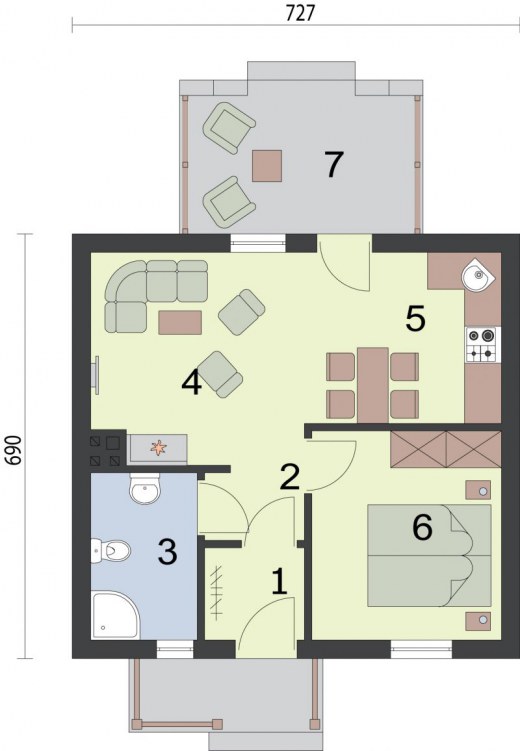 Projekt dostępny również jako CAŁOROCZNY!!! Zobacz czym różni się projekt domku letniskowego od domu całorocznego?MANOA - dom letniskowy Ten projekt dedykowany jest tym wszystkim, którzy są zdecydowani na inwestycję w dom letniskowy (dostępny także jako całoroczny). Praktyczne i estetyczne rozwiązania takie jak dwuspadowy dach, gustowne zestawienie kolorów elewacji zachęcają potencjalnych inwestorów. Podobnie dachówki i cokolik odpowiadają sobie kolorami, tworząc przemyślaną, zrównoważoną kompozycję. Zadaszone wejście od południa zachęca do odwiedzenia wnętrz. Weranda wiedzie do wiatrołapu, z którego przechodzi się do przedpokoju. Po lewej stronie znajduje się łazienka, natomiast po prawej stronie komunikacji jest dość obszerna sypialnia. Od komunikacji na wprost usytuowany jest pokój dzienny z aneksem kuchennym, w którym znajduje się kominek. Jest to miejsce, które z pewnością w zimowe wieczory będzie skupiać życie wypoczywających w domu ludzi. Letnie dni z pewnością nierozłącznie będą kojarzyć się z czasem spędzonym w wesołej atmosferze przy grillu na tarasie.Projekt składa się z części architektonicznej, konstrukcyjnej, wewnętrznych instalacji wod.-kan, c. o. i elektrycznej. W projekcie załączone są podstawowe zestawienie stali, drewna i stolarki okienno-drzwiowej. Do projektu dołączamy bezpłatną zgodę na wprowadzenie zmian, oświadczenie projektantów o wykonaniu projektu zgodnie z obowiązującymi normami i przepisami oraz kserokopie uprawnień projektantów wraz z aktualnym wpisem do izby. W przypadku zamówienia projektu w technologii lekkiej, drewnianej konstrukcji szkieletowej, powierzchnia użytkowa budynku jest o około 7% większa