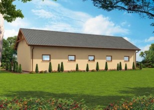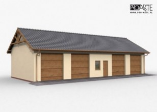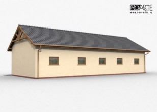 Budynek gospodarczy, wolnostojący. Projekt składa się z części architektonicznej, konstrukcyjnej i wewnętrznej instalacji elektrycznej. W projekcie załączone są podstawowe zestawienie stali, drewna i stolarki okienno-drzwiowej. Do projektu dołączamy bezpłatną zgodę na wprowadzenie zmian, oświadczenie projektantów o wykonaniu projektu zgodnie z obowiązującymi normami i przepisami oraz kserokopie uprawnień projektantów wraz z aktualnym wpisem do izby. W przypadku zamówienia projektu w technologii lekkiej, drewnianej konstrukcji szkieletowej, powierzchnia użytkowa budynku jest o około 7% większa.