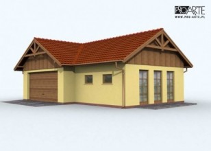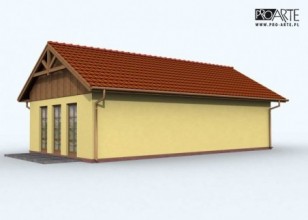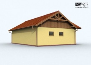 Budynek gospodarczy, wolnostojący. Projekt składa się z części architektonicznej, konstrukcyjnej i wewnętrznej instalacji elektrycznej. W projekcie załączone są podstawowe zestawienie stali, drewna i stolarki okienno-drzwiowej. Do projektu dołączamy bezpłatną zgodę na wprowadzenie zmian, oświadczenie projektantów o wykonaniu projektu zgodnie z obowiązującymi normami i przepisami oraz kserokopie uprawnień projektantów wraz z aktualnym wpisem do izby. W przypadku zamówienia projektu w technologii lekkiej, drewnianej konstrukcji szkieletowej, powierzchnia użytkowa budynku jest o około 7% większa.