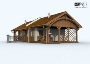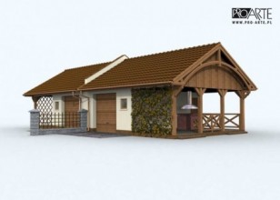 Budynek gospodarczy, wolnostojący. Projekt składa się z części architektonicznej, konstrukcyjnej i wewnętrznej instalacji elektrycznej. W projekcie załączone są podstawowe zestawienie stali, drewna i stolarki okienno-drzwiowej. Do projektu dołączamy bezpłatną zgodę na wprowadzenie zmian, oświadczenie projektantów o wykonaniu projektu zgodnie z obowiązującymi normami i przepisami oraz kserokopie uprawnień projektantów wraz z aktualnym wpisem do izby. W przypadku zamówienia projektu w technologii lekkiej, drewnianej konstrukcji szkieletowej, powierzchnia użytkowa budynku jest o około 7% większa.