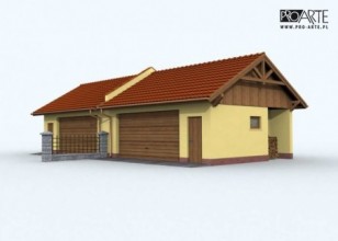 Budynek gospodarczy, wolnostojący. Projekt składa się z części architektonicznej, konstrukcyjnej i wewnętrznej instalacji elektrycznej. W projekcie załączone są podstawowe zestawienie stali, drewna i stolarki okienno-drzwiowej. Do projektu dołączamy bezpłatną zgodę na wprowadzenie zmian, oświadczenie projektantów o wykonaniu projektu zgodnie z obowiązującymi normami i przepisami oraz kserokopie uprawnień projektantów wraz z aktualnym wpisem do izby. W przypadku zamówienia projektu w technologii lekkiej, drewnianej konstrukcji szkieletowej, powierzchnia użytkowa budynku jest o około 7% większa.
