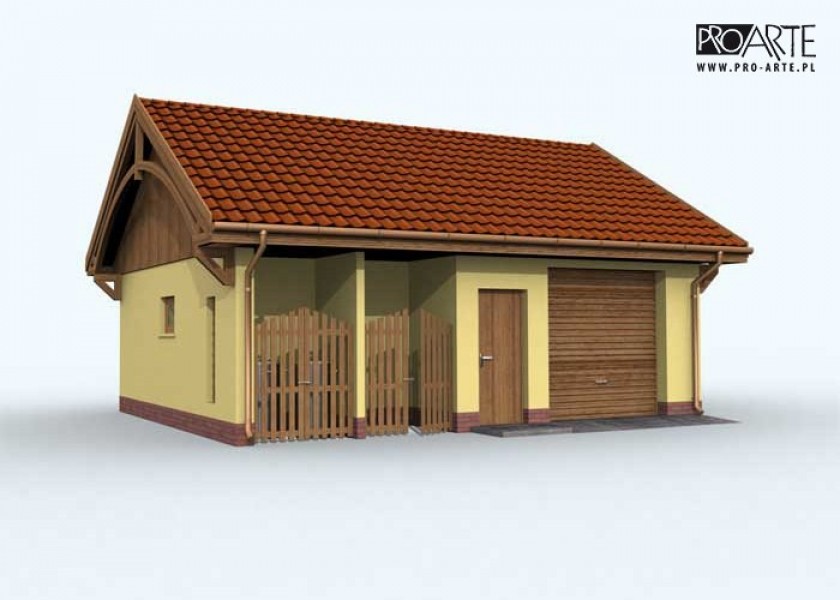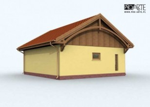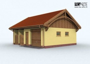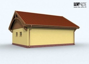 Budynek gospodarczy, wolnostojący. Projekt składa się z części architektonicznej, konstrukcyjnej i wewnętrznej instalacji elektrycznej. W projekcie załączone są podstawowe zestawienie stali, drewna i stolarki okienno-drzwiowej. Do projektu dołączamy bezpłatną zgodę na wprowadzenie zmian, oświadczenie projektantów o wykonaniu projektu zgodnie z obowiązującymi normami i przepisami oraz kserokopie uprawnień projektantów wraz z aktualnym wpisem do izby. W przypadku zamówienia projektu w technologii lekkiej, drewnianej konstrukcji szkieletowej, powierzchnia użytkowa budynku jest o około 7% większa.