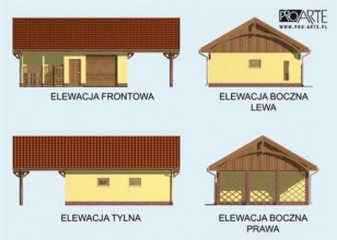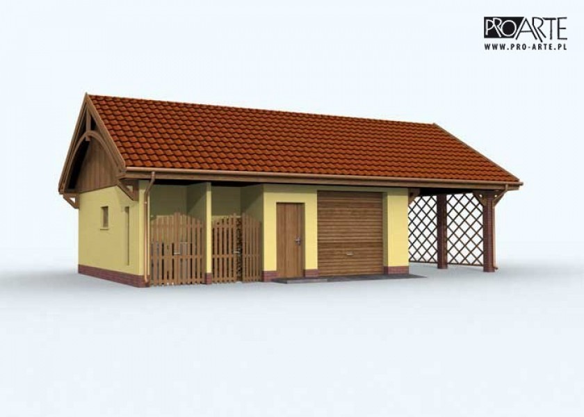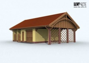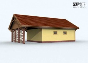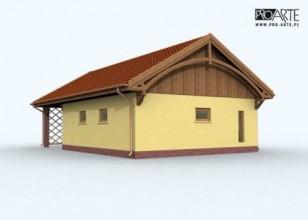 Budynek gospodarczy, wolnostojący. Projekt składa się z części architektonicznej, konstrukcyjnej i wewnętrznej instalacji elektrycznej. W projekcie załączone są podstawowe zestawienie stali, drewna i stolarki okienno-drzwiowej. Do projektu dołączamy bezpłatną zgodę na wprowadzenie zmian, oświadczenie projektantów o wykonaniu projektu zgodnie z obowiązującymi normami i przepisami oraz kserokopie uprawnień projektantów wraz z aktualnym wpisem do izby. W przypadku zamówienia projektu w technologii lekkiej, drewnianej konstrukcji szkieletowej, powierzchnia użytkowa budynku jest o około 7% większa.