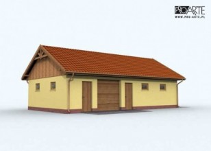 Budynek gospodarczy, wolnostojący. Projekt składa się z części architektonicznej, konstrukcyjnej i wewnętrznej instalacji elektrycznej. W projekcie załączone są podstawowe zestawienie stali, drewna i stolarki okienno-drzwiowej. Do projektu dołączamy bezpłatną zgodę na wprowadzenie zmian, oświadczenie projektantów o wykonaniu projektu zgodnie z obowiązującymi normami i przepisami oraz kserokopie uprawnień projektantów wraz z aktualnym wpisem do izby. W przypadku zamówienia projektu w technologii lekkiej, drewnianej konstrukcji szkieletowej, powierzchnia użytkowa budynku jest o około 7% większa.