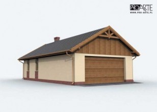 Budynek gospodarczy, wolnostojący. Projekt składa się z części architektonicznej, konstrukcyjnej i wewnętrznej instalacji elektrycznej. W projekcie załączone są podstawowe zestawienie stali, drewna i stolarki okienno-drzwiowej. Do projektu dołączamy bezpłatną zgodę na wprowadzenie zmian, oświadczenie projektantów o wykonaniu projektu zgodnie z obowiązującymi normami i przepisami oraz kserokopie uprawnień projektantów wraz z aktualnym wpisem do izby. W przypadku zamówienia projektu w technologii lekkiej, drewnianej konstrukcji szkieletowej, powierzchnia użytkowa budynku jest o około 7% większa.