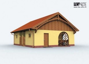Budynek gospodarczy, wolnostojący. Projekt składa się z części architektonicznej, konstrukcyjnej i wewnętrznej instalacji elektrycznej. W projekcie załączone są podstawowe zestawienie stali, drewna i stolarki okienno-drzwiowej. Do projektu dołączamy bezpłatną zgodę na wprowadzenie zmian, oświadczenie projektantów o wykonaniu projektu zgodnie z obowiązującymi normami i przepisami oraz kserokopie uprawnień projektantów wraz z aktualnym wpisem do izby. W przypadku zamówienia projektu w technologii lekkiej, drewnianej konstrukcji szkieletowej, powierzchnia użytkowa budynku jest o około 7% większa.
