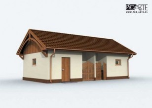 Budynek gospodarczy, wolnostojący. Projekt składa się z części architektonicznej, konstrukcyjnej i wewnętrznej instalacji elektrycznej. W projekcie załączone są podstawowe zestawienie stali, drewna i stolarki okienno-drzwiowej. Do projektu dołączamy bezpłatną zgodę na wprowadzenie zmian, oświadczenie projektantów o wykonaniu projektu zgodnie z obowiązującymi normami i przepisami oraz kserokopie uprawnień projektantów wraz z aktualnym wpisem do izby. W przypadku zamówienia projektu w technologii lekkiej, drewnianej konstrukcji szkieletowej, powierzchnia użytkowa budynku jest o około 7% większa.