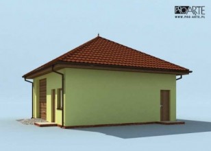 Budynek gospodarczy, wolnostojący. Projekt składa się z części architektonicznej, konstrukcyjnej i wewnętrznej instalacji elektrycznej. W projekcie załączone są podstawowe zestawienie stali, drewna i stolarki okienno-drzwiowej. Do projektu dołączamy bezpłatną zgodę na wprowadzenie zmian, oświadczenie projektantów o wykonaniu projektu zgodnie z obowiązującymi normami i przepisami oraz kserokopie uprawnień projektantów wraz z aktualnym wpisem do izby. W przypadku zamówienia projektu w technologii lekkiej, drewnianej konstrukcji szkieletowej, powierzchnia użytkowa budynku jest o około 7% większa.