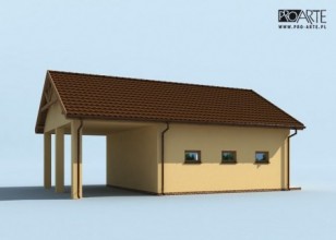 Budynek gospodarczy, wolnostojący. Projekt składa się z części architektonicznej, konstrukcyjnej i wewnętrznej instalacji elektrycznej. W projekcie załączone są podstawowe zestawienie stali, drewna i stolarki okienno-drzwiowej. Do projektu dołączamy bezpłatną zgodę na wprowadzenie zmian, oświadczenie projektantów o wykonaniu projektu zgodnie z obowiązującymi normami i przepisami oraz kserokopie uprawnień projektantów wraz z aktualnym wpisem do izby. W przypadku zamówienia projektu w technologii lekkiej, drewnianej konstrukcji szkieletowej, powierzchnia użytkowa budynku jest o około 7% większa.