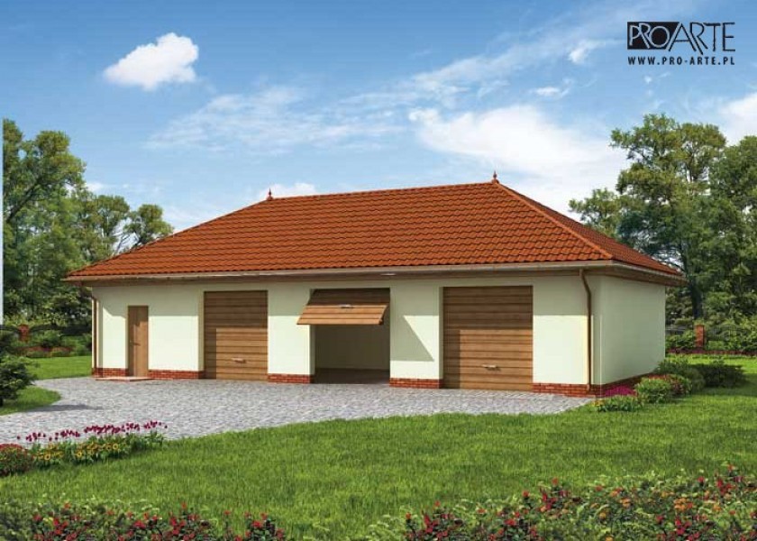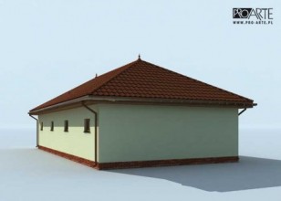 Budynek gospodarczy, wolnostojący. Projekt składa się z części architektonicznej, konstrukcyjnej i wewnętrznej instalacji elektrycznej. W projekcie załączone są podstawowe zestawienie stali, drewna i stolarki okienno-drzwiowej. Do projektu dołączamy bezpłatną zgodę na wprowadzenie zmian, oświadczenie projektantów o wykonaniu projektu zgodnie z obowiązującymi normami i przepisami oraz kserokopie uprawnień projektantów wraz z aktualnym wpisem do izby. W przypadku zamówienia projektu w technologii lekkiej, drewnianej konstrukcji szkieletowej, powierzchnia użytkowa budynku jest o około 7% większa.