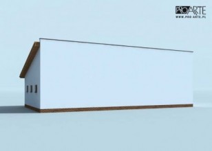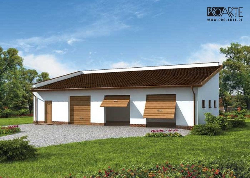 Budynek gospodarczy, wolnostojący. Projekt składa się z części architektonicznej, konstrukcyjnej i wewnętrznej instalacji elektrycznej. W projekcie załączone są podstawowe zestawienie stali, drewna i stolarki okienno-drzwiowej. Do projektu dołączamy bezpłatną zgodę na wprowadzenie zmian, oświadczenie projektantów o wykonaniu projektu zgodnie z obowiązującymi normami i przepisami oraz kserokopie uprawnień projektantów wraz z aktualnym wpisem do izby.Wymiar bram garażowych to 2.4mx2.5mW przypadku zamówienia projektu w technologii lekkiej, drewnianej konstrukcji szkieletowej, powierzchnia użytkowa budynku jest o około 7% większa.