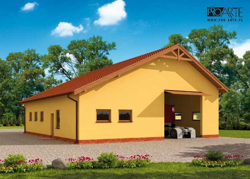 Budynek gospodarczy, wolnostojący. Projekt składa się z części architektonicznej, konstrukcyjnej i wewnętrznej instalacji elektrycznej. W projekcie załączone są podstawowe zestawienie stali, drewna i stolarki okienno-drzwiowej. Do projektu dołączamy bezpłatną zgodę na wprowadzenie zmian, oświadczenie projektantów o wykonaniu projektu zgodnie z obowiązującymi normami i przepisami oraz kserokopie uprawnień projektantów wraz z aktualnym wpisem do izby. W przypadku zamówienia projektu w technologii lekkiej, drewnianej konstrukcji szkieletowej, powierzchnia użytkowa budynku jest o około 7% większa.