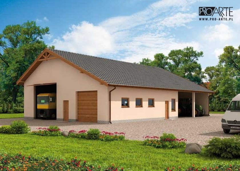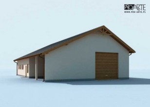 Budynek gospodarczy, wolnostojący. Projekt składa się z części architektonicznej, konstrukcyjnej i wewnętrznej instalacji elektrycznej. W projekcie załączone są podstawowe zestawienie stali, drewna i stolarki okienno-drzwiowej. Do projektu dołączamy bezpłatną zgodę na wprowadzenie zmian, oświadczenie projektantów o wykonaniu projektu zgodnie z obowiązującymi normami i przepisami oraz kserokopie uprawnień projektantów wraz z aktualnym wpisem do izby. W przypadku zamówienia projektu w technologii lekkiej, drewnianej konstrukcji szkieletowej, powierzchnia użytkowa budynku jest o około 7% większa.