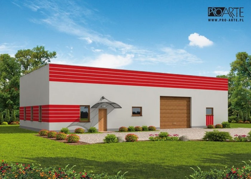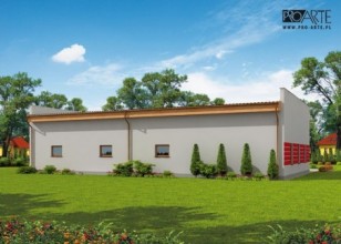 Budynek gospodarczy, wolnostojący. Projekt składa się z części architektonicznej, konstrukcyjnej i wewnętrznej instalacji elektrycznej. W projekcie załączone są podstawowe zestawienie stali, drewna i stolarki okienno-drzwiowej. Do projektu dołączamy bezpłatną zgodę na wprowadzenie zmian, oświadczenie projektantów o wykonaniu projektu zgodnie z obowiązującymi normami i przepisami oraz kserokopie uprawnień projektantów wraz z aktualnym wpisem do izby. W przypadku zamówienia projektu w technologii lekkiej, drewnianej konstrukcji szkieletowej, powierzchnia użytkowa budynku jest o około 7% większa.
