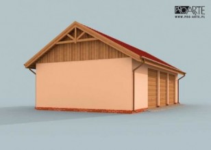 Budynek gospodarczy, wolnostojący. Projekt składa się z części architektonicznej, konstrukcyjnej i wewnętrznej instalacji elektrycznej. W projekcie załączone są podstawowe zestawienie stali, drewna i stolarki okienno-drzwiowej. Do projektu dołączamy bezpłatną zgodę na wprowadzenie zmian, oświadczenie projektantów o wykonaniu projektu zgodnie z obowiązującymi normami i przepisami oraz kserokopie uprawnień projektantów wraz z aktualnym wpisem do izby. W przypadku zamówienia projektu w technologii lekkiej, drewnianej konstrukcji szkieletowej, powierzchnia użytkowa budynku jest o około 7% większa.