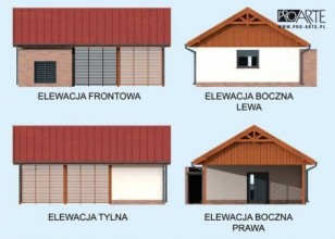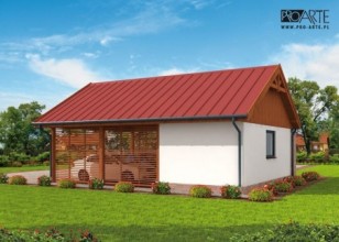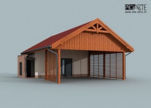Budynek gospodarczy, wolnostojący. Projekt składa się z części architektonicznej, konstrukcyjnej i wewnętrznej instalacji elektrycznej. W projekcie załączone są podstawowe zestawienie stali, drewna i stolarki okienno-drzwiowej. Do projektu dołączamy bezpłatną zgodę na wprowadzenie zmian, oświadczenie projektantów o wykonaniu projektu zgodnie z obowiązującymi normami i przepisami oraz kserokopie uprawnień projektantów wraz z aktualnym wpisem do izby. W przypadku zamówienia projektu w technologii lekkiej, drewnianej konstrukcji szkieletowej, powierzchnia użytkowa budynku jest o około 7% większa.