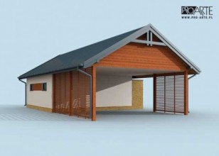 Budynek gospodarczy, wolnostojący. Projekt składa się z części architektonicznej, konstrukcyjnej i wewnętrznej instalacji elektrycznej. W projekcie załączone są podstawowe zestawienie stali, drewna i stolarki okienno-drzwiowej. Do projektu dołączamy bezpłatną zgodę na wprowadzenie zmian, oświadczenie projektantów o wykonaniu projektu zgodnie z obowiązującymi normami i przepisami oraz kserokopie uprawnień projektantów wraz z aktualnym wpisem do izby. W przypadku zamówienia projektu w technologii lekkiej, drewnianej konstrukcji szkieletowej, powierzchnia użytkowa budynku jest o około 7% większa.
