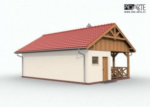Budynek gospodarczy, wolnostojący. Projekt składa się z części architektonicznej, konstrukcyjnej i wewnętrznej instalacji elektrycznej. W projekcie załączone są podstawowe zestawienie stali, drewna i stolarki okienno-drzwiowej. Do projektu dołączamy bezpłatną zgodę na wprowadzenie zmian, oświadczenie projektantów o wykonaniu projektu zgodnie z obowiązującymi normami i przepisami oraz kserokopie uprawnień projektantów wraz z aktualnym wpisem do izby. W przypadku zamówienia projektu w technologii lekkiej, drewnianej konstrukcji szkieletowej, powierzchnia użytkowa budynku jest o około 7% większa.