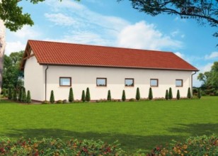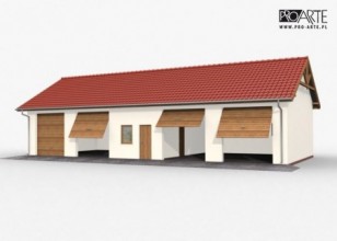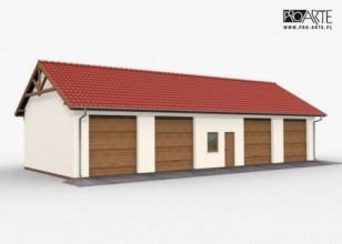 Budynek gospodarczy w technologii szkieletowej, wolnostojący. Budynek posiada dodatkowe czterypomieszczenia gospodarcze.Cztery bramy wjazdowe o wymiarach 2800x3000. Zobacz również budynek w wersjii murowanej.