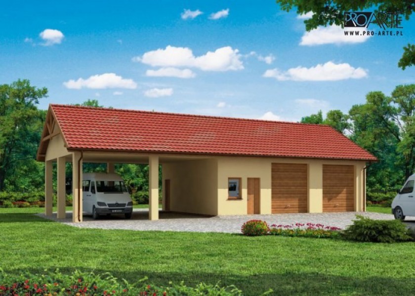Budynek gospodarczy z czterema pomieszczeniami gospodarczymi i wiatą w technologii szkieletowej, wolnostojący, parterowy. Budynek posiada dwie bramy wjazdowe o wymiarach 2800x3000. Zobacz budynek w wersjii murowanej.