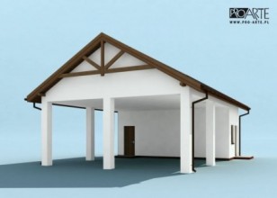 Budynek gospodarczy, wolnostojący. Projekt składa się z części architektonicznej, konstrukcyjnej i wewnętrznej instalacji elektrycznej. W projekcie załączone są podstawowe zestawienie stali, drewna i stolarki okienno-drzwiowej. Do projektu dołączamy bezpłatną zgodę na wprowadzenie zmian, oświadczenie projektantów o wykonaniu projektu zgodnie z obowiązującymi normami i przepisami oraz kserokopie uprawnień projektantów wraz z aktualnym wpisem do izby. W przypadku zamówienia projektu w technologii lekkiej, drewnianej konstrukcji szkieletowej, powierzchnia użytkowa budynku jest o około 7% większa.