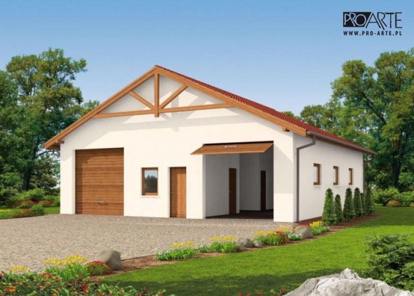 Budynek gospodarczy, wolnostojący. Projekt budynku składa się z 6 egzemplarzy, a w tym 3 tomów części architektoniczno-budowlanej oraz 3 technicznej. W projekcie załączone są podstawowe zestawienie stali, drewna i stolarki okienno-drzwiowej. Do projektu dołączamy bezpłatną zgodę na wprowadzenie zmian, oświadczenie projektantów o wykonaniu projektu zgodnie z obowiązującymi normami i przepisami oraz kserokopie uprawnień projektantów wraz z aktualnym wpisem do izby.  W przypadku zamówienia projektu w technologii lekkiej, drewnianej konstrukcji szkieletowej, powierzchnia użytkowa budynku jest o około 7% większa.
