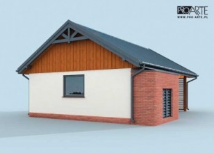 Budynek gospodarczy, wolnostojący. Projekt składa się z części architektonicznej, konstrukcyjnej i wewnętrznej instalacji elektrycznej. W projekcie załączone są podstawowe zestawienie stali, drewna i stolarki okienno-drzwiowej. Do projektu dołączamy bezpłatną zgodę na wprowadzenie zmian, oświadczenie projektantów o wykonaniu projektu zgodnie z obowiązującymi normami i przepisami oraz kserokopie uprawnień projektantów wraz z aktualnym wpisem do izby. W przypadku zamówienia projektu w technologii lekkiej, drewnianej konstrukcji szkieletowej, powierzchnia użytkowa budynku jest o około 7% większa.