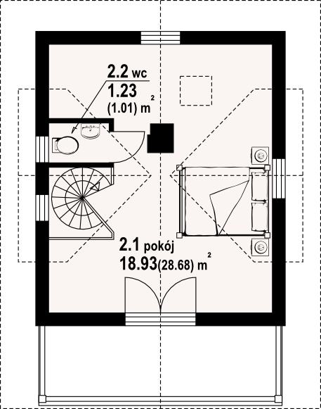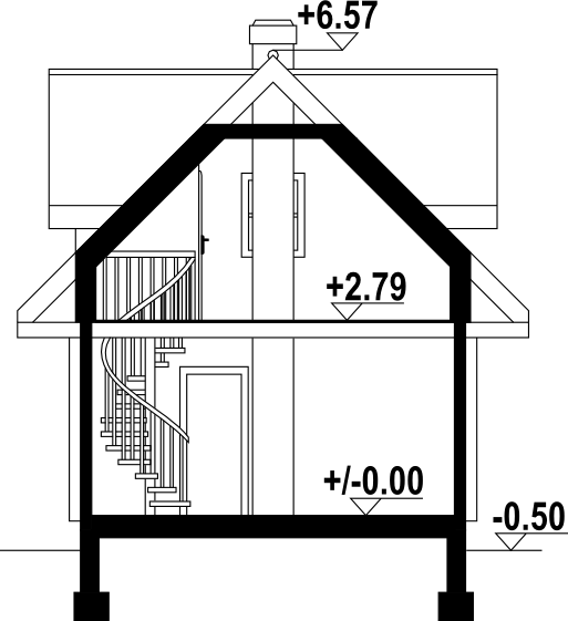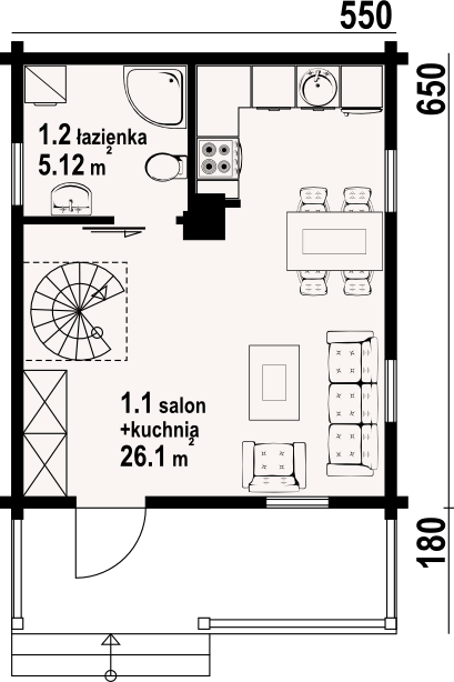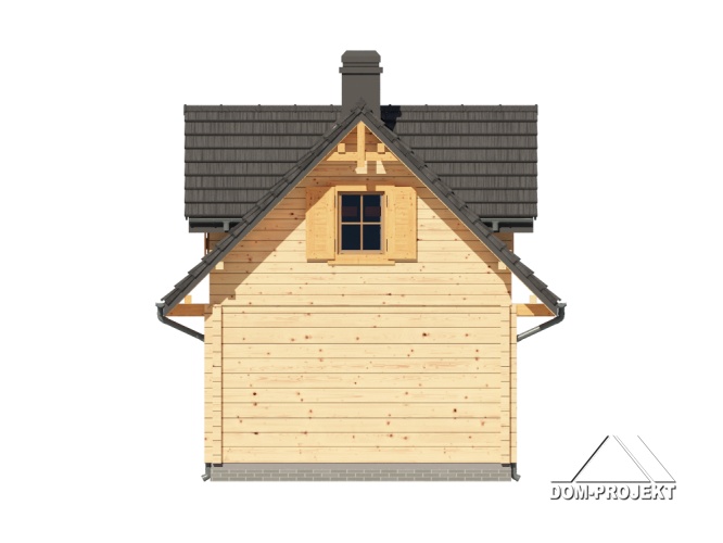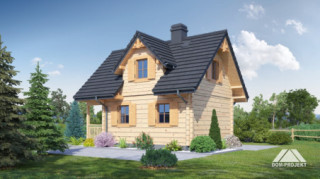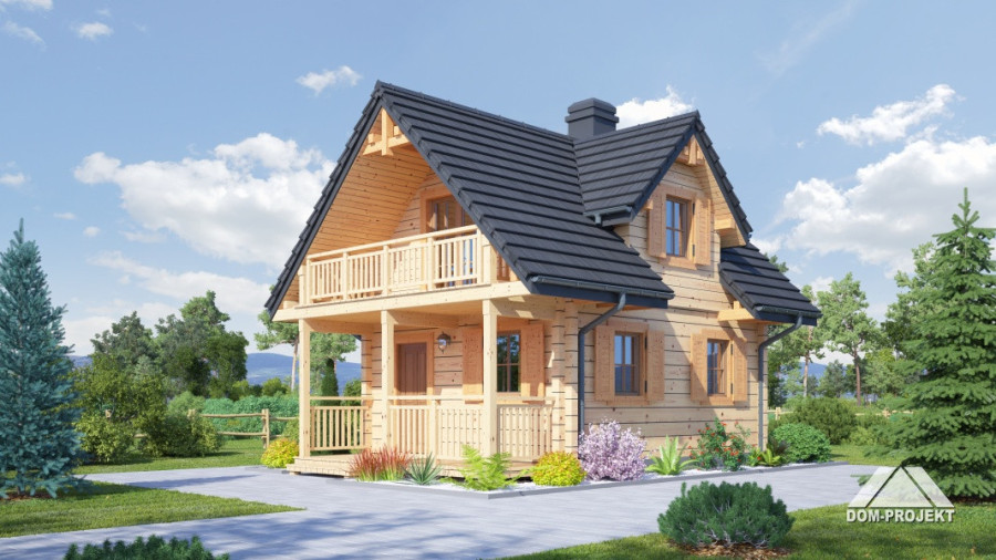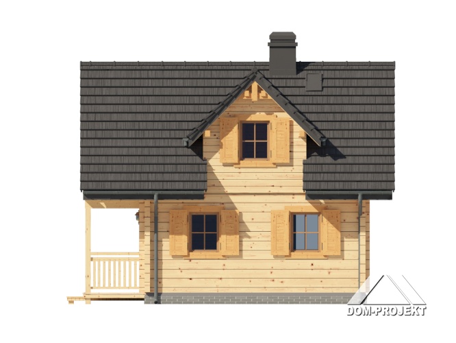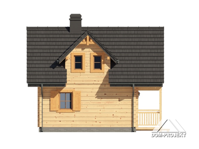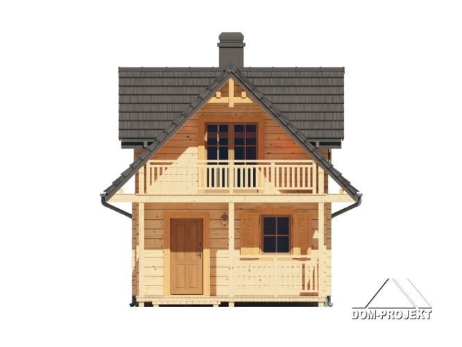 Mały domek letniskowy z bali drewnianych. Na parterze salon z kuchnią, łazienka I schody na poddasze. Na poddaszu pokój, wc oraz balkon. Zwarta bryła budynku i dach dwuspadowy sprzyjają szybkiej i taniej budowie i niskim kosztom eksploatacji.