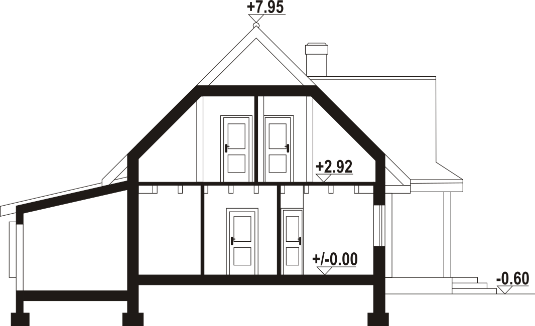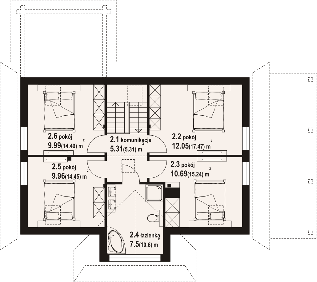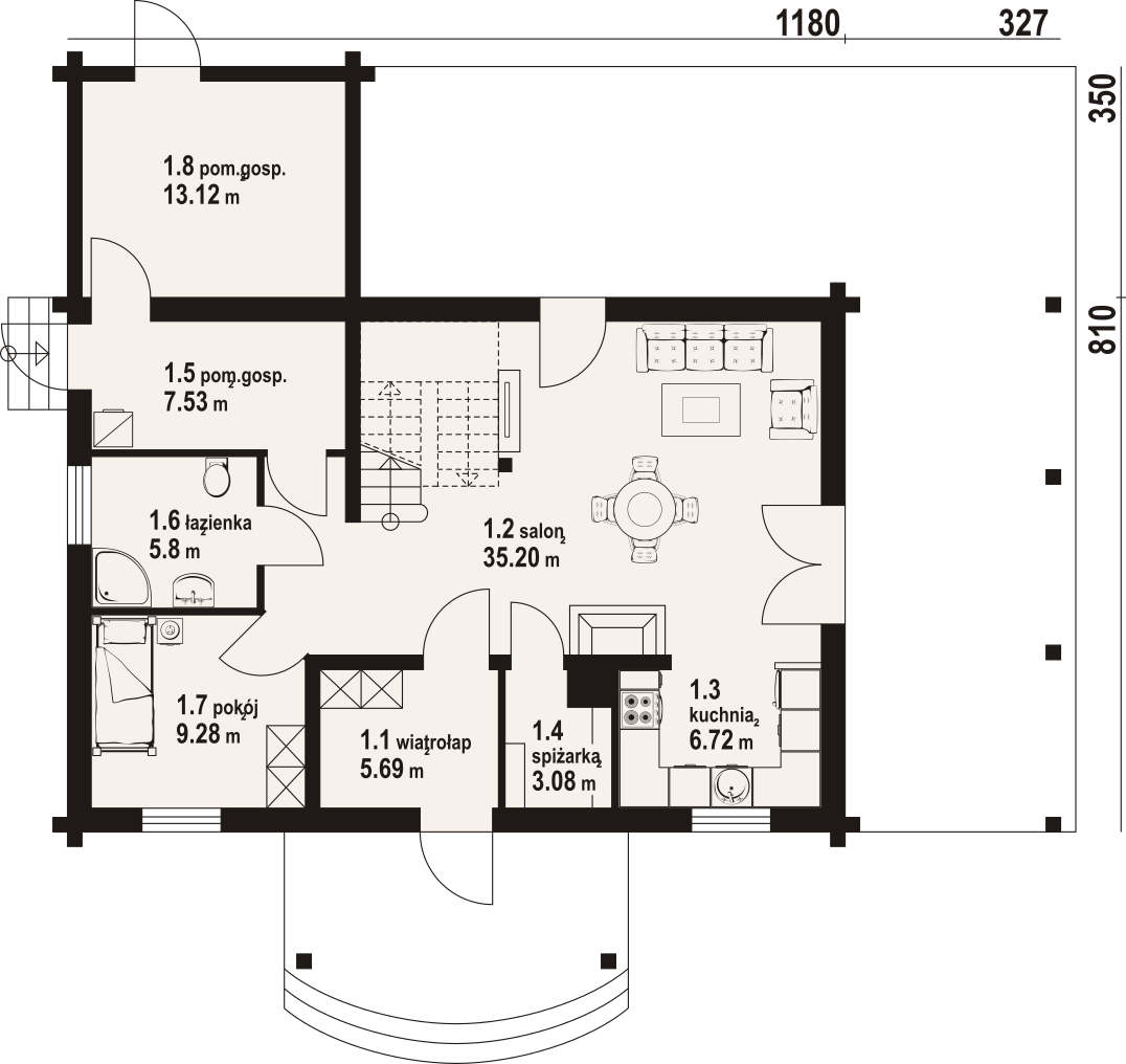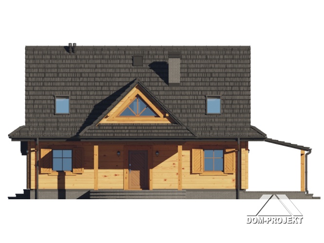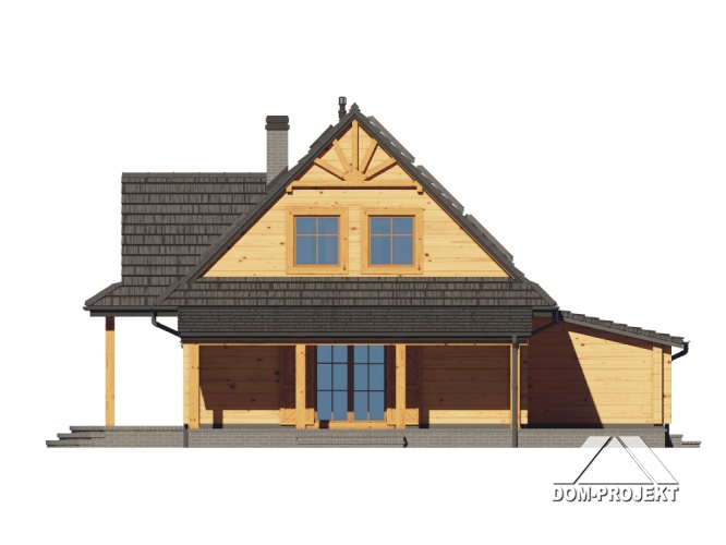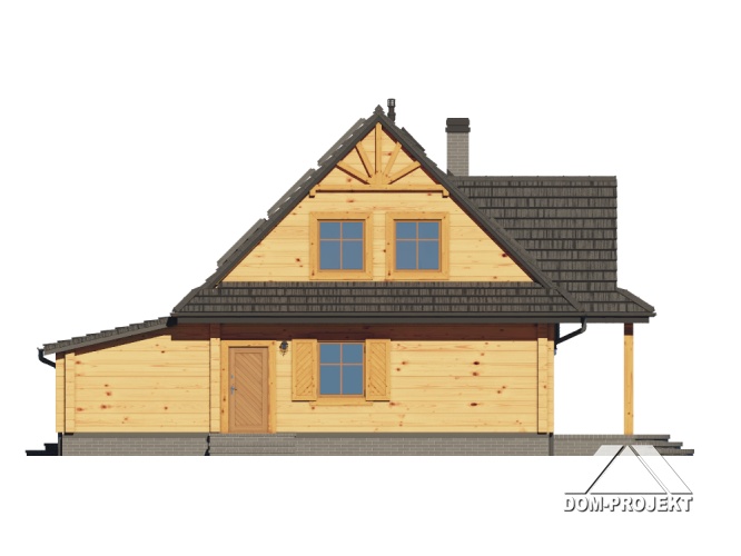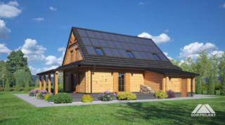 Dom z bali z poddaszem użytkowym. Na parterze salon z kuchnią, kominkiem, wyjściem na duży, zadaszony taras i schodami na poddasze. Pokój, wiatrołap, spiżarka, łazienka, dwa pomieszczenia gospodarcze. Na poddaszu cztery pokoje, łazienka, komunikacja. Zwarta bryła budynku oraz dach dwuspadowy sprzyjają szybkiej i taniej budowie oraz niskim kosztom eksploatacji.