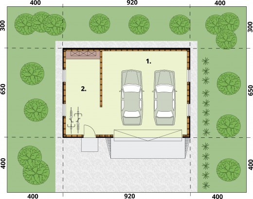 G293 szkielet drewniany budynek gospodarczy. Brama garażowa o wymiarach 5,0x2,4m Projekt garażu/budynku gospodarczego w bardzo popularnym i zoptymalizowanym wymiarze, pomieści dwa stanowiska postojowe oraz pomieszczenie gospodarcze, które można wykorzystać jako warsztat, miejsce do przechowywania. Technologia szkieletowa wygeneruje więcej powierzchni użytkowej niż wersja murowana tego samego projektu. Kopertowy dach będzie udanie nawiązywał do dachu domu o tej samej konstrukcji.
