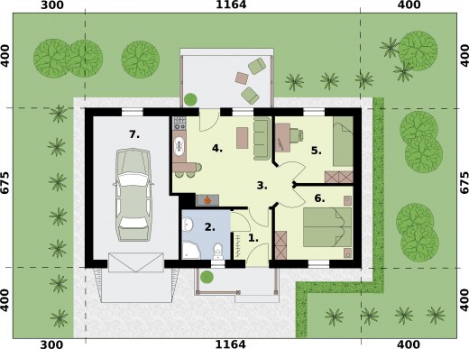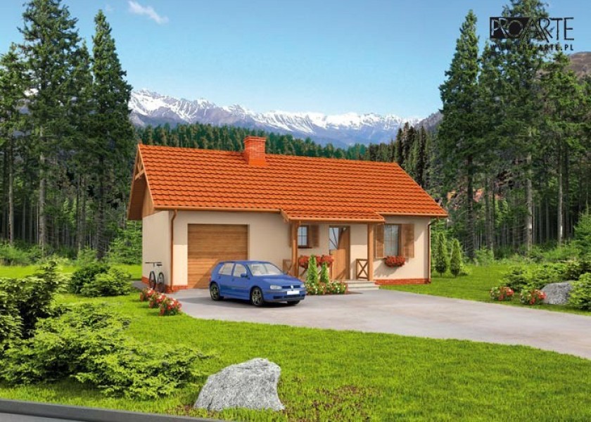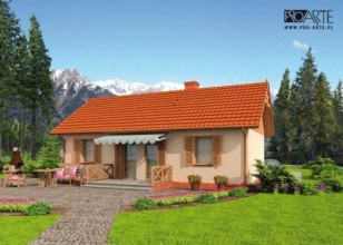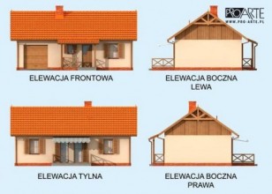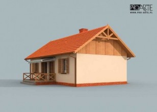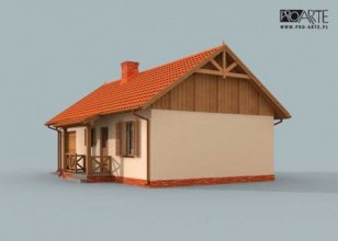 Projekt dostępny również jako CAŁOROCZNY!!! Zobacz czym różni się projekt domku letniskowego od domu całorocznego?AVERNO - dom letniskowyAverno będzie wyborem dla wszystkich żądających praktycznych rozwiązań w rozsądnej cenie. Domek świetnie nadaje się do wybudowania na łonie przyrody, z dala od zgiełku miasta. Od frontu budynku znajduje się garaż połączony dwuspadowym dachem z domem, po jego prawej stronie usytuowany jest zadaszony drewniany ganek, będący przedłużeniem dachu budynku. Przez ganek wchodzi się do domu. Na północnej ścianie Averny znajdziemy taras, świetnie sprawdzający się w czasie pięknej pogody jako miejsce odpoczynku w gronie bliskich. Bryła budynku urzeka prostotą, wyważeniem proporcji, objawiającym się m.in. w braku zbędnych elementów. Na załączonej wizualizacji świetnie widać, jak z gustem i harmonijnie dobrano kolor ścian, dachówki i cokoliku. Urokliwy i ciepły charakter elewacji jest tylko zapowiedzią przytulnych oraz komfortowych wnętrz. Weranda wiedzie do wiatrołapu, z którego przechodzi się do komunikacji. Po lewej stronie znajduje się łazienka, natomiast po prawej stronie komunikacji jest dość obszerna sypialnia. Za nią znajduje się jeszcze jeden pokój sypialny, np. dla dziecka, lub gości. Od komunikacji na wprost usytuowany jest pokój dzienny z aneksem kuchennym, w którym znajduje się kominek. Jest to miejsce, które z pewnością w zimowe wieczory będzie skupiać życie wypoczywających w domu ludzi.Projekt składa się z części architektonicznej, konstrukcyjnej, wewnętrznych instalacji wod.-kan, c. o. i elektrycznej. W projekcie załączone są podstawowe zestawienie stali, drewna i stolarki okienno-drzwiowej. Do projektu dołączamy bezpłatną zgodę na wprowadzenie zmian, oświadczenie projektantów o wykonaniu projektu zgodnie z obowiązującymi normami i przepisami oraz kserokopie uprawnień projektantów wraz z aktualnym wpisem do izby. W przypadku zamówienia projektu w technologii lekkiej, drewnianej konstrukcji szkieletowej, powierzchnia użytkowa budynku jest o około 7% większa.