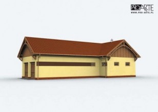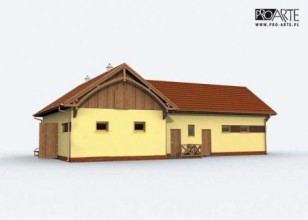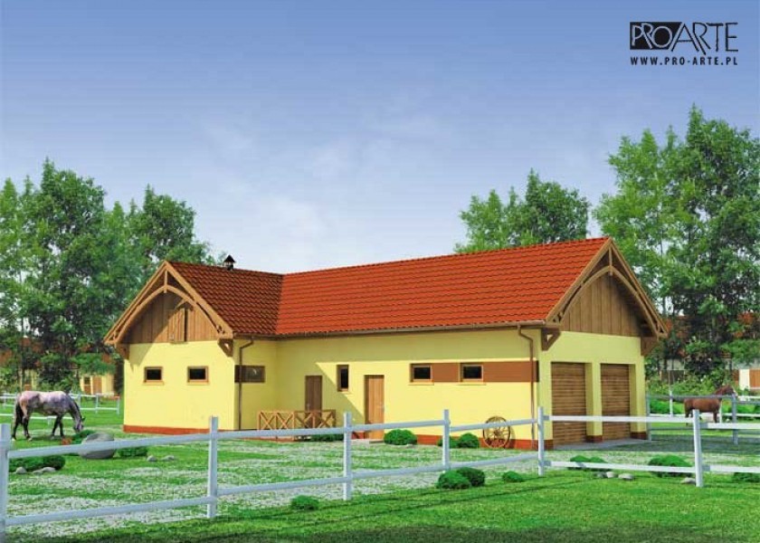 Budynek z czterema pomieszczeniami gospodarczymi i łazienką.Może również pełnić funkcję garażową lub magazynową. Zobacz stajnie S14.Projekt składa się z części architektonicznej, konstrukcyjnej, wewnętrznej instalacji wod-kan. i wewnętrznej instalacji elektrycznej. W projekcie załączone są podstawowe zestawienie stali, drewna i stolarki okienno-drzwiowej. Do projektu dołączamy bezpłatną zgodę na wprowadzenie zmian, oświadczenie projektantów o wykonaniu projektu zgodnie z obowiązującymi normami i przepisami oraz kserokopie uprawnień projektantów wraz z aktualnym wpisem do izby. W przypadku zamówienia projektu w technologii lekkiej, drewnianej konstrukcji szkieletowej, powierzchnia użytkowa budynku jest o około 7% większa.