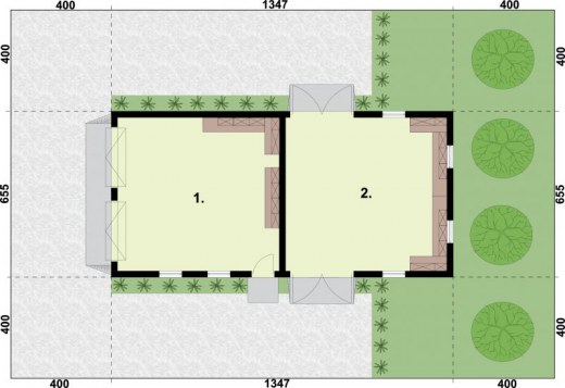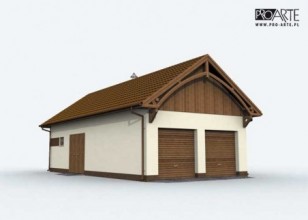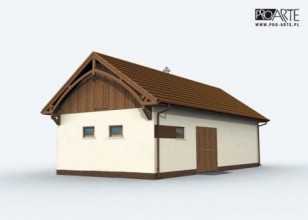 Budynek gospodarczy z 2 pomieszczeniami.Może również pełnić funkcję magazynową. Projekt składa się z części architektonicznej, konstrukcyjnej, wewnętrznej elektrycznej. W projekcie załączone są podstawowe zestawienie stali, drewna i stolarki okienno-drzwiowej. Do projektu dołączamy bezpłatną zgodę na wprowadzenie zmian, oświadczenie projektantów o wykonaniu projektu zgodnie z obowiązującymi normami i przepisami oraz kserokopie uprawnień projektantów wraz z aktualnym wpisem do izby. W przypadku zamówienia projektu w technologii lekkiej, drewnianej konstrukcji szkieletowej, powierzchnia użytkowa budynku jest o około 7% większa.