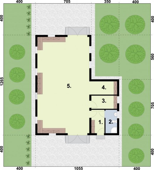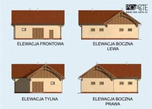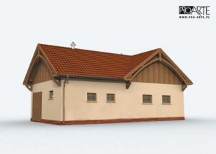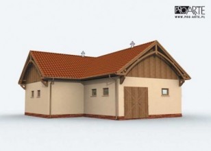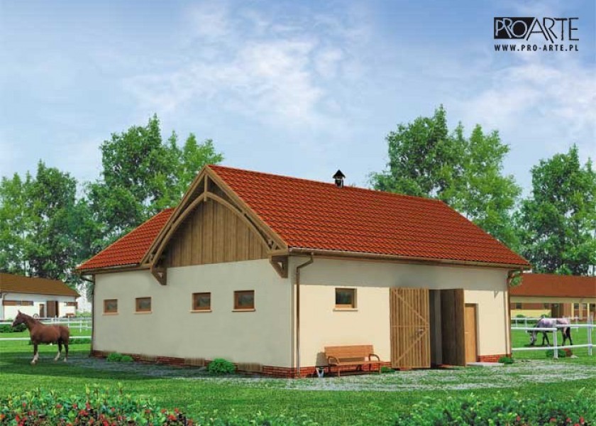 Budynek gospodarczy z czterema pomieszczeniami i łazienką.Może również pełnić funkcję garażową lub magazynową. Zobacz stajnie S16.Projekt składa się z części architektonicznej, konstrukcyjnej, wewnętrznej instalacji wod-kan. i wewnętrznej instalacji elektrycznej. W projekcie załączone są podstawowe zestawienie stali, drewna i stolarki okienno-drzwiowej. Do projektu dołączamy bezpłatną zgodę na wprowadzenie zmian, oświadczenie projektantów o wykonaniu projektu zgodnie z obowiązującymi normami i przepisami oraz kserokopie uprawnień projektantów wraz z aktualnym wpisem do izby. W przypadku zamówienia projektu w technologii lekkiej, drewnianej konstrukcji szkieletowej, powierzchnia użytkowa budynku jest o około 7% większa.