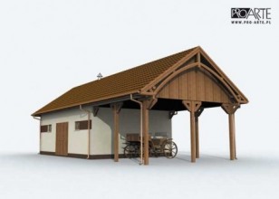 Budynek gospodarczy z trzema pomieszczeniami, z wiatą garażową dwustanowiskową, łazienką i poddaszem użytkowym. Może również pełnić funkcję magazynową. Zobacz wersję stajni S3 na 2 boksy. Projekt składa się z części architektonicznej, konstrukcyjnej, wewnętrznej instalacji wod-kan. i wewnętrznej instalacji elektrycznej. W projekcie załączone są podstawowe zestawienie stali, drewna i stolarki okienno-drzwiowej. Do projektu dołączamy bezpłatną zgodę na wprowadzenie zmian, oświadczenie projektantów o wykonaniu projektu zgodnie z obowiązującymi normami i przepisami oraz kserokopie uprawnień projektantów wraz z aktualnym wpisem do izby. W przypadku zamówienia projektu w technologii lekkiej, drewnianej konstrukcji szkieletowej, powierzchnia użytkowa budynku jest o około 7% większa.