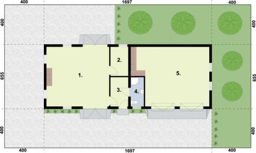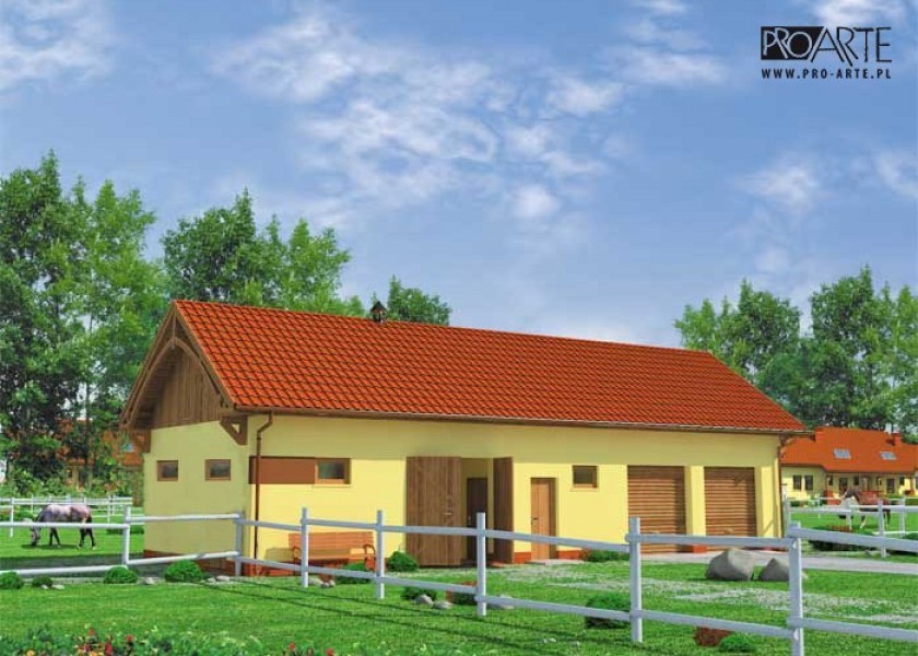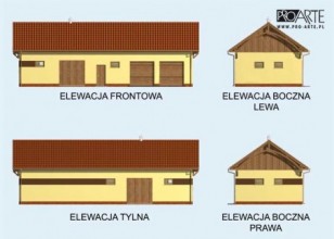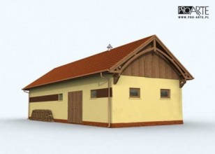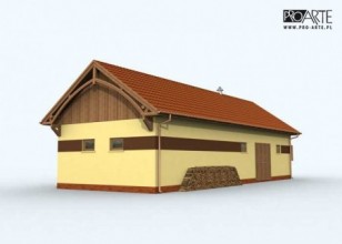 Budynek gospodarczy z czterema pomieszczeniami i łazienką.Może również pełnić funkcję garażową lubmagazynową. Projekt składa się z części architektonicznej, konstrukcyjnej, wewnętrznej instalacji wod-kan. i wewnętrznej instalacji elektrycznej. W projekcie załączone są podstawowe zestawienie stali, drewna i stolarki okienno-drzwiowej. Do projektu dołączamy bezpłatną zgodę na wprowadzenie zmian, oświadczenie projektantów o wykonaniu projektu zgodnie z obowiązującymi normami i przepisami oraz kserokopie uprawnień projektantów wraz z aktualnym wpisem do izby. W przypadku zamówienia projektu w technologii lekkiej, drewnianej konstrukcji szkieletowej, powierzchnia użytkowa budynku jest o około 7% większa.