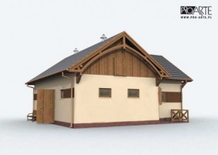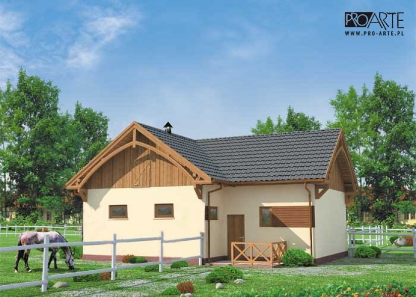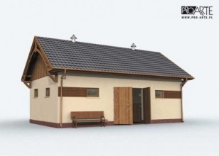 Budynek gospodarczy z trzema pomieszczeniami i łazienką.Może również pełnić funkcję garażową lub magazynową. Zobacz stajnie S8.Projekt składa się z części architektonicznej, konstrukcyjnej, wewnętrznej instalacji wod-kan. i wewnętrznej instalacji elektrycznej. W projekcie załączone są podstawowe zestawienie stali, drewna i stolarki okienno-drzwiowej. Do projektu dołączamy bezpłatną zgodę na wprowadzenie zmian, oświadczenie projektantów o wykonaniu projektu zgodnie z obowiązującymi normami i przepisami oraz kserokopie uprawnień projektantów wraz z aktualnym wpisem do izby. W przypadku zamówienia projektu w technologii lekkiej, drewnianej konstrukcji szkieletowej, powierzchnia użytkowa budynku jest o około 7% większa.