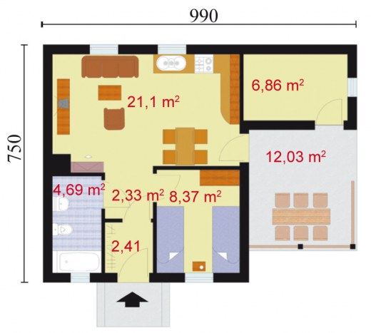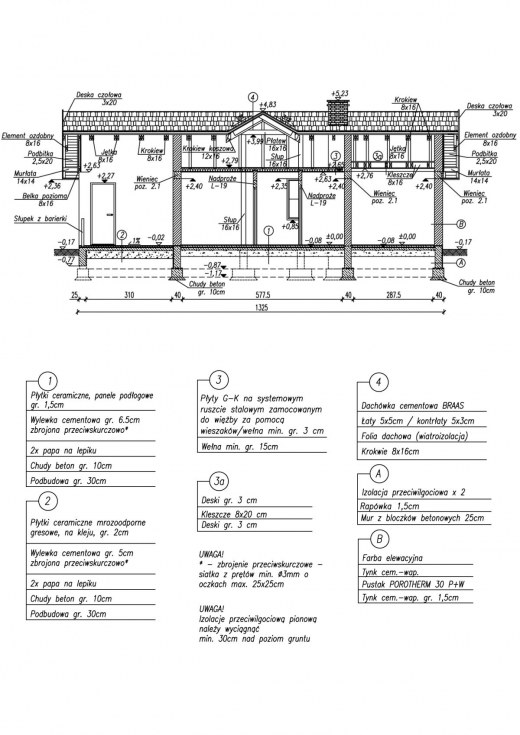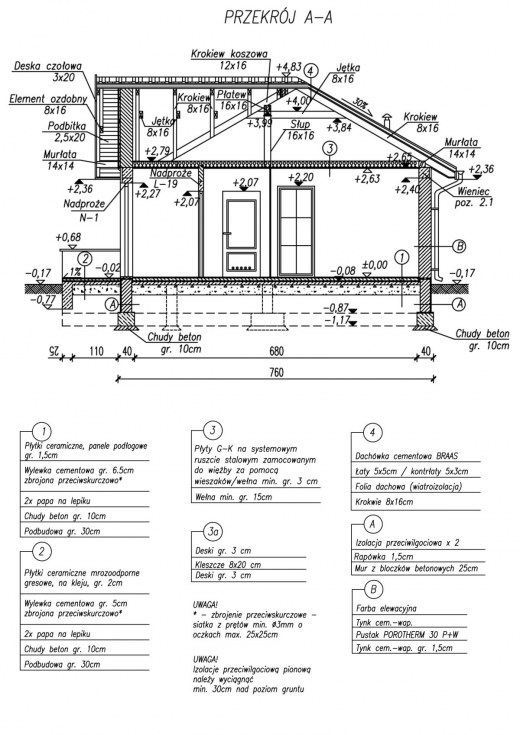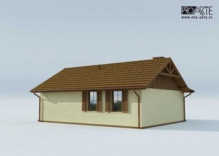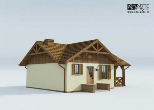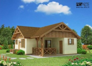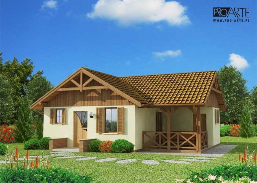 Projekt dostępny również jako CAŁOROCZNY!!! Zobacz czym różni się projekt domku letniskowego od domu całorocznego?BOGOTA - dom letniskowyProjekt Bogota to niezwykle ciepła propozycja, urzekająca z zewnątrz drewnianymi wykończeniami na granicy między dachem a ścianami zewnętrznymi budynku. Ten domek letniskowy (dostępny także w wersji całorocznej) stanowi dobre rozwiązane dla osób nastawiających się przede wszystkim na spędzanie czasu na wolnym powietrzu, ponieważ przewidziano tutaj miejsce na obszerną werandę, z której można wyjść do ogrodu. Stanowi ona ciekawą ozdobę całego obiektu, ponieważ pomiędzy balustradą wokół niej a dachem poprowadzono drewniane wsparcia, pełniące rolę filarów. Z werandy można bezpośrednio wejść do pomieszczenia gospodarczego, co okaże się bardzo wygodnym rozwiązaniem, podczas wykonywania prac ogrodowych – będziemy mieli, bowiem przechowywane tam narzędzia i sprzęty, zawsze pod ręką. Wejście do domu zostało umieszczone pomiędzy dwoma niewysokimi murkami, co dodaje elewacji frontowej domu wiele uroku. W środku, przez wiatrołap i komunikację, możemy wejść do jednego z trzech pomieszczeń (nie licząc już werandy oraz pomieszczenia gospodarczego). Gdy już wejdziemy, po prawej stronie mamy pokój, w którym możemy urządzić sypialnię, ponieważ to miejsce jest oddzielone od pozostałych pomieszczeń w domu. Po lewej stronie natomiast przewidziano miejsce na łazienkę. Najwięcej miejsca zajmuje jednak pokój dzienny z aneksem kuchennym, który możemy podzielić na dwie zasadnicze części – pierwszą – typowo wypoczynkową, drugą – poświęconą na przygotowywanie i spożywanie posiłków. Właśnie w drugiej części, możemy wydzielić miejsce na rodzinny stół sąsiadujący z wyjściem na werandę. Czy ten projekt zaspokoi Twoje potrzeby?Projekt składa się z części architektonicznej, konstrukcyjnej, wewnętrznych instalacji wod.-kan, c. o. i elektrycznej. W projekcie załączone są podstawowe zestawienie stali, drewna i stolarki okienno-drzwiowej. Do projektu dołączamy bezpłatną zgodę na wprowadzenie zmian, oświadczenie projektantów o wykonaniu projektu zgodnie z obowiązującymi normami i przepisami oraz kserokopie uprawnień projektantów wraz z aktualnym wpisem do izby. W przypadku zamówienia projektu w technologii lekkiej, drewnianej konstrukcji szkieletowej, powierzchnia użytkowa budynku jest o około 7% większa.