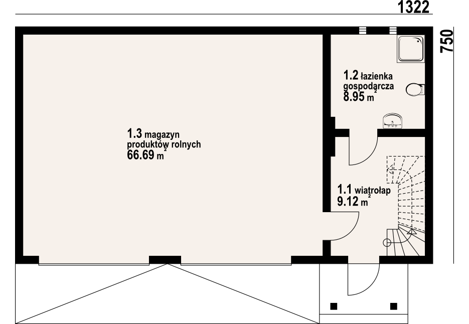 Budynek gospodarczy. - magazyn produktów rolnych z łazienką gospodarczą i schodami na poddasze. Na poddaszu strych.
