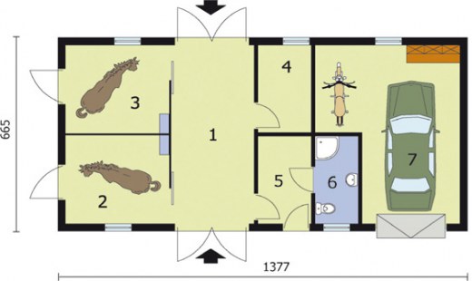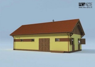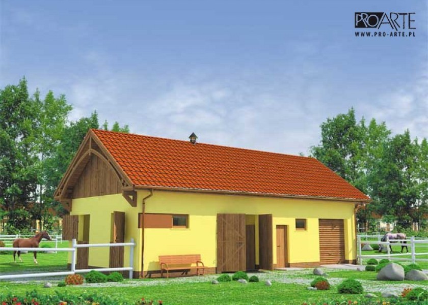 Zobacz wersję budynku gospodarczego BGS4Ta wspaniała stajnia posiada dwa, ustawione naprzeciwko siebie szerokie i wysokie wejścia połączone przestronną komunikacją, którą mogą przemieszczać się zwierzęta. Dodatkowo, przebywające w niej konie, mogą wyjść na zewnątrz bezpośrednio z boksów usytuowanych przy zachodniej ścianie budynku. Projekt przewiduje dwa, dosyć obszerne boksy, wygodną komunikację poprowadzoną od południa ku północy stajni, a także kilka pomieszczeń dodatkowych. Jest więc osobne pomieszczenie przeznaczone na paszę, siodlarnia, z której przechodzi się do wygodnej łazienki oraz, co ciekawe, garaż.Projekt tej stajni został stworzony z myślą o osobach, które kochają konie, ale nie chcą rozwijać ich hodowli. Jeżeli budynek powstanie przy domu, może służyć jako dodatkowy garaż. Jeżeli natomiast zostanie zbudowany w znacznej odległości miejsca zamieszkania właścicieli, garaż będzie stanowił wygodne rozwiązanie, ponieważ ochroni pojazd przed wpływem warunków zewnętrznych.Projekt stajni dla koni. Projekt stajni składa się z czterech egzemplarzy a w tym części architektonicznej, konstrukcyjnej, wewnętrznych instalacji wod.-kan i instalacji wewnętrznej elektrycznej. W projekcie załączone są podstawowe zestawienie stali, drewna i stolarki okienno-drzwiowej. Do projektu dołączamy bezpłatną zgodę na wprowadzenie zmian, oświadczenie projektantów o wykonaniu projektu zgodnie z obowiązującymi normami i przepisami oraz kserokopie uprawnień projektantów wraz z aktualnym wpisem do izby.Kochasz konie? Zapraszamy do serwisu ogłoszeniowego i forum http://allekonie.pl