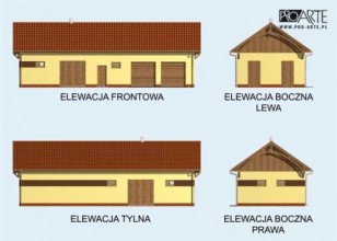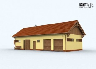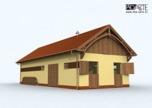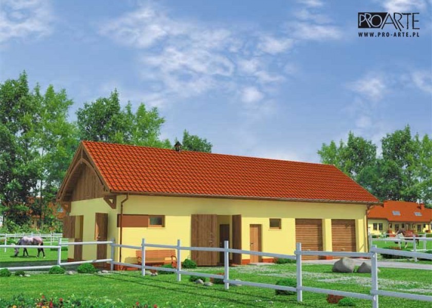 Niezwykle funkcjonalny projekt łączący w sobie zalety stajni i garażu. Miejsce dla koni zostało przewidziane z lewej strony budynku. Zwierzęta mogą wyjść na zewnątrz bezpośrednio z boksów, jak i komunikacją wewnątrz budynku. Bezpośrednio z komunikacji można także przejść do paszalni lub siodlarni, w której znajduje się wejście do łazienki zaopatrzonej w kabinę prysznicową. Drugą, wyodrębnioną część budynku stanowi obszerny garaż przeznaczony na dwa samochody, z miejscem na urządzenie warsztatu. Ten projekt będzie zatem przeznaczony dla osób pragnących posiadać dwustanowiskowy garaż połączony z dwoma boksami dla koni. Budynek będzie odpowiednim uzupełnieniem dla wygodnego domu.Projekt stajni dla koni. Projekt stajni składa się z czterech egzemplarzy a w tym części architektonicznej, konstrukcyjnej, wewnętrznych instalacji wod.-kan i instalacji wewnętrznej elektrycznej. W projekcie załączone są podstawowe zestawienie stali, drewna i stolarki okienno-drzwiowej. Do projektu dołączamy bezpłatną zgodę na wprowadzenie zmian, oświadczenie projektantów o wykonaniu projektu zgodnie z obowiązującymi normami i przepisami oraz kserokopie uprawnień projektantów wraz z aktualnym wpisem do izby.Poddasze użytkowe:18,52m2Kochasz konie? Zapraszamy do serwisu ogłoszeniowego i forum http://allekonie.pl