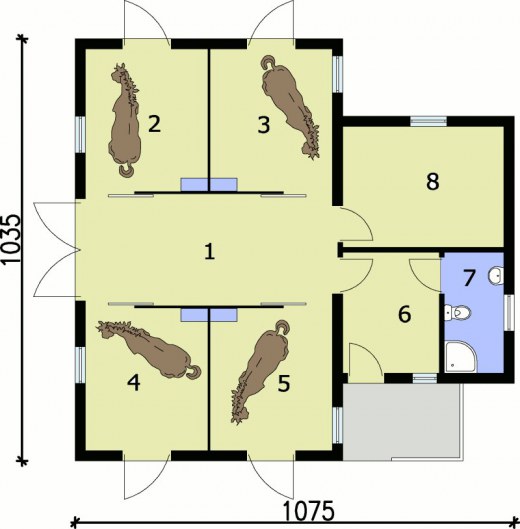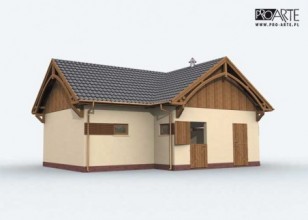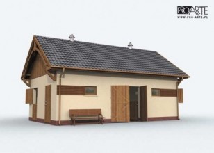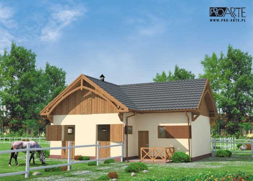 Zobacz wersję budynku gospodarczego BGS8Ten projekt stajni okaże się świetnym rozwiązaniem dla osób, myślących o nieco rozbudowanej hodowli koni. Mamy tu bowiem cztery wygodne boksy (jednak zbyt małe dla dużej, mającej się oźrebić klaczy), z których zwierzęta mogą bezpośrednio wyjść na zewnątrz budynku. Ponadto wszystkie boksy zostały połączone obszerną komunikacją, z której wyjście znajduje się z lewej strony budynku. W drugiej części budynku, stanowiącej swoisty wykusz przewidziano paszalnię, do której wchodzi się wprost z komunikacji przeznaczonej dla zwierząt oraz siodlarnię z dostępem do łazienki. Siodlarnia została zaopatrzona w dodatkowe wyjście na zewnątrz otoczone niewielkim ganeczkiem. Jeżeli myślisz o posiadaniu czterech koni, to ten projekt będzie dla Ciebie z pewnością wygodnym rozwiązaniem! Projekt stajni dla koni. Projekt stajni składa się z czterech egzemplarzy a w tym części architektonicznej, konstrukcyjnej, wewnętrznych instalacji wod.-kan i instalacji wewnętrznej elektrycznej. W projekcie załączone są podstawowe zestawienie stali, drewna i stolarki okienno-drzwiowej. Do projektu dołączamy bezpłatną zgodę na wprowadzenie zmian, oświadczenie projektantów o wykonaniu projektu zgodnie z obowiązującymi normami i przepisami oraz kserokopie uprawnień projektantów wraz z aktualnym wpisem do izby.Projekt posiada strych.Kochasz konie? Zapraszamy do serwisu ogłoszeniowego i forum http://allekonie.pl